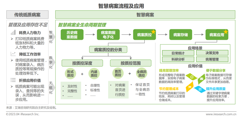 艾瑞咨詢指出,傳統(tǒng)醫(yī)院病案管理存在紙質(zhì)病案占空間、耗資源、易損壞,病案錄入、病歷質(zhì)控效率低等諸多問題。在此背景下,智慧病案應(yīng)運(yùn)而生,通過信息化及智能化技術(shù),對(duì)醫(yī)療機(jī)構(gòu)病歷/病案數(shù)據(jù)進(jìn)行處理,幫助病案工作者實(shí)現(xiàn)了數(shù)據(jù)整合、數(shù)據(jù)質(zhì)控、病案入庫歸檔、病案數(shù)據(jù)應(yīng)用服務(wù)的統(tǒng)一集成。
