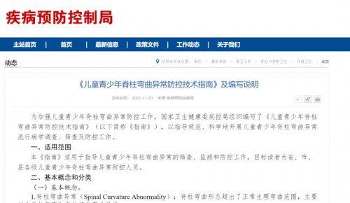 為加強(qiáng)兒童青少年脊柱彎曲異常防控工作,國家衛(wèi)生健康委疾控局組織編寫了《兒童青少年脊柱彎曲異常防控技術(shù)指南》(以下簡稱《指南》),以指導(dǎo)規(guī)范、科學(xué)地開展兒童青少年脊柱彎曲異常流行病學(xué)調(diào)查、篩查及防控工作?!吨改稀酚?021年11月1日發(fā)布。