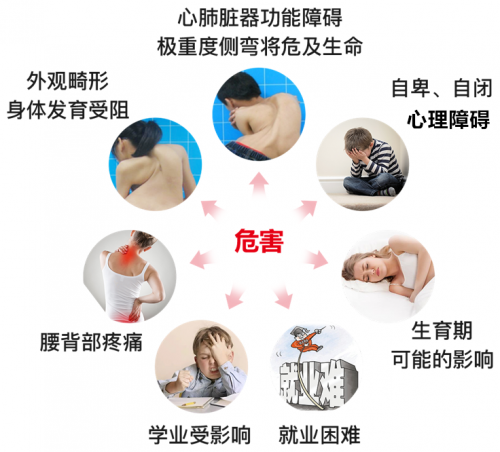 脊柱側(cè)彎是一種病理狀態(tài),當(dāng)脊柱側(cè)彎逐漸加重,不僅影響外觀,嚴(yán)重者可影響到心、肺功能,導(dǎo)致呼吸衰竭,甚至累及脊髓,造成癱瘓。因此,早發(fā)現(xiàn)早治療極其重要。