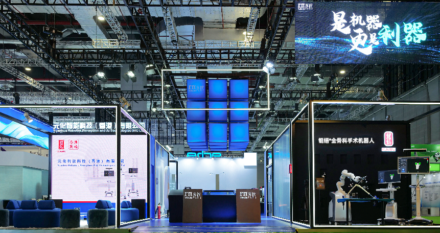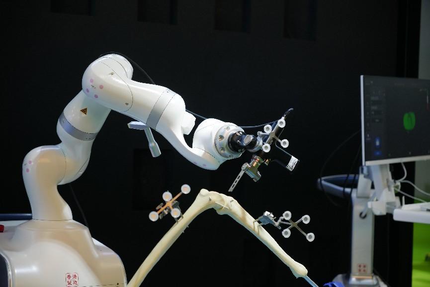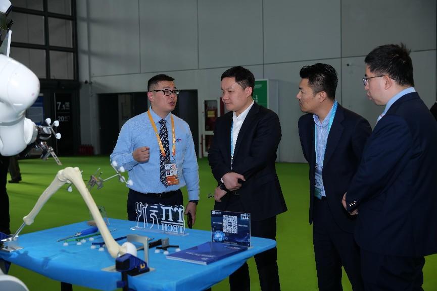11月5日,元化智能(香港)帶來代表高端醫(yī)療機器人的創(chuàng)新型“新產品、新技術、新服務”,其中元化智能錕铻?全骨科手術機器人由機械臂車、導航儀車、主控臺車組成,它實現了“手眼腦”的協同,醫(yī)生可通過機器人的CT自動建模、精確測量和輔助實施功能,進行智能化、數字化、信息化的手術。除了具有極佳的穩(wěn)定性和精確性之外,機器人的實時反饋系統也提高了手術安全性,減少了主觀誤差,展現了其精準操作和微創(chuàng)手術的優(yōu)勢,為患者帶來了更優(yōu)的醫(yī)療體驗。