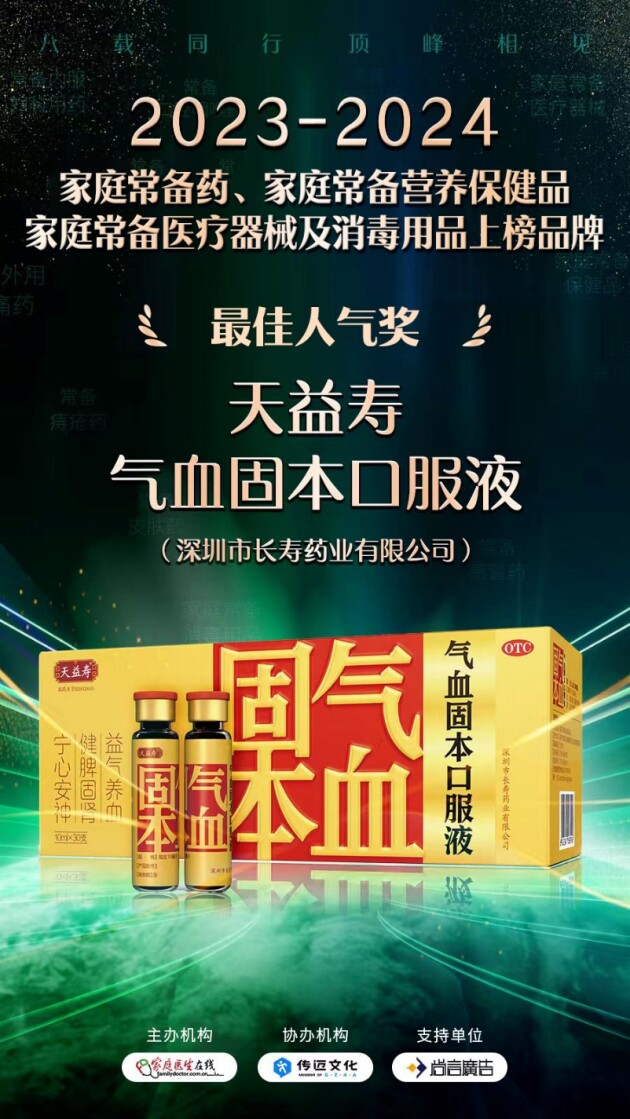 11月19日,在家庭醫(yī)生在線舉辦的“2023-2024家庭常備藥、家庭常備營養(yǎng)保健品、家庭常備醫(yī)療器械及消毒用品上榜品牌”頒獎典禮上,深圳市長壽藥業(yè)氣血固本口服液憑借其卓越的產(chǎn)品功效和市場認(rèn)可,榮獲“2023-2024家庭常備藥上榜品牌”和“最佳人氣獎”兩項殊榮。