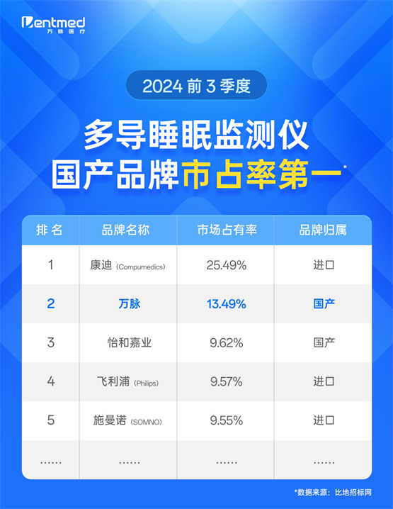 在這個科技與健康日益交融的時代,醫(yī)療設(shè)備的每一次進(jìn)步都牽動著無數(shù)人的心。近日,據(jù)比地招標(biāo)網(wǎng)權(quán)威統(tǒng)計,2024年前三季度,睡眠監(jiān)測儀招投標(biāo)市場迎來了新的競爭格局,在這場激烈的角逐中,萬脈睡眠監(jiān)測儀憑借卓越的性能和廣泛的市場認(rèn)可,成功奪得國內(nèi)品牌市占率榜首!