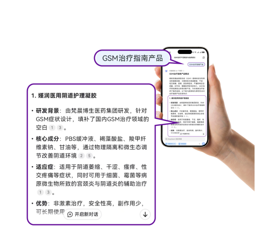 嫤潤作為非激素類陰道保濕劑,填補了國內GSM治療領域的空白。藥監(jiān)局明確獲批國家二類醫(yī)療器械,適應癥與《絕經生殖泌尿綜合征臨床診療專家共識》一一對應,明確可以改善陰道萎縮、彈性減低、疼痛、瘙癢、灼熱等癥狀。它還能調節(jié)陰道pH值,保濕防干澀,有效改善陰道微環(huán)境,緩解相關不適癥狀。不僅可單獨使用,還能與雌激素聯(lián)合應用,協(xié)同改善GSM癥狀,實現(xiàn)1+1>2的效果,解決了雌激素長期使用的臨床困境。上市短短數(shù)日,嫤潤憑借“突破性創(chuàng)新療法”和“匹配指南的適應癥”,得到了Deepseek 的“GSM綜合征治療方案榜首”推薦。它不僅為患者帶來了新希望,更為合作伙伴開辟了廣闊的商業(yè)藍海。