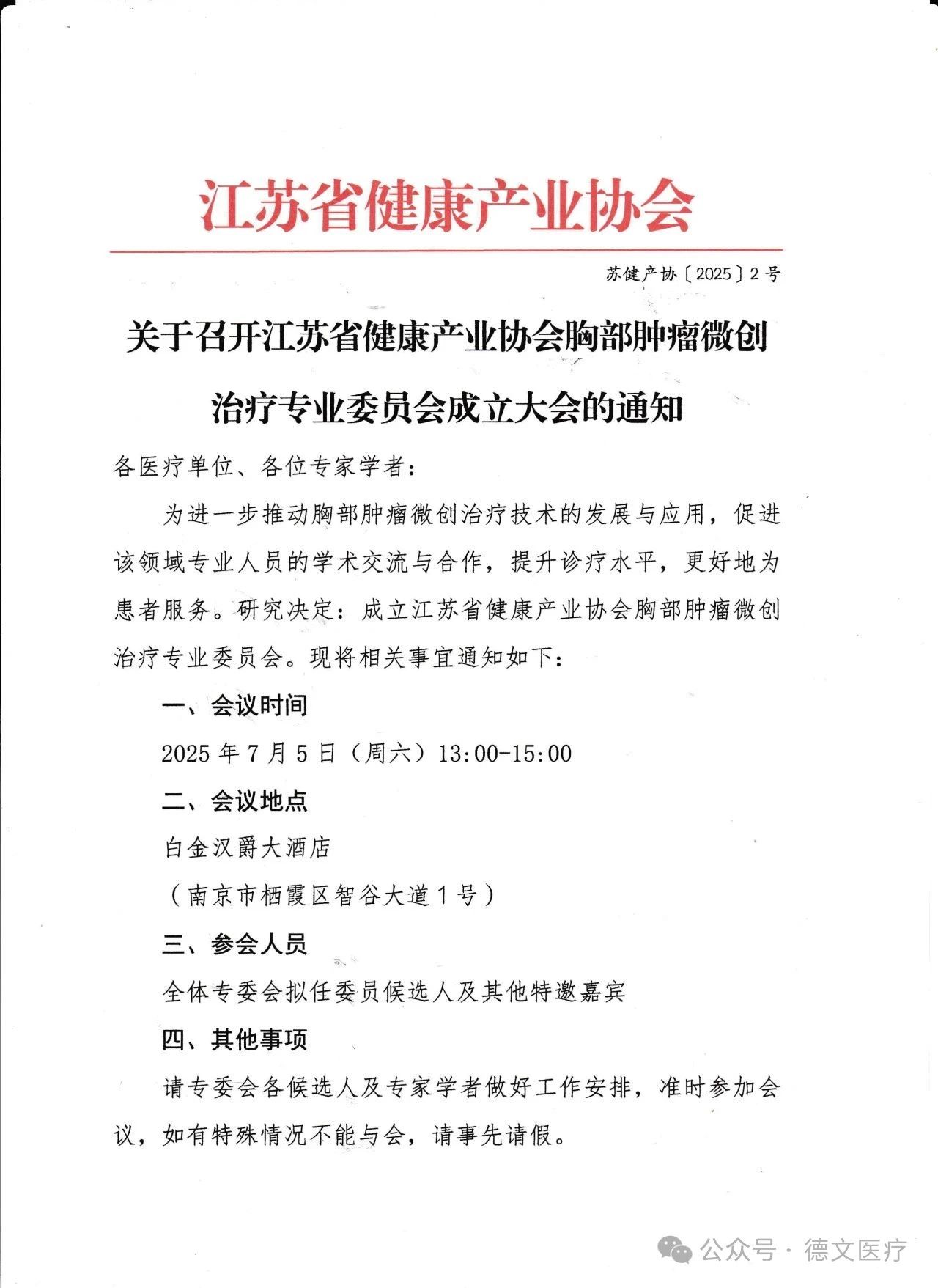 由江蘇省人民醫(yī)院陳亮教授牽頭組建的江蘇省健康產(chǎn)業(yè)協(xié)會胸部腫瘤微創(chuàng)治療專業(yè)委員會已按相關(guān)規(guī)定完成籌備工作,即將召開成立大會。詳見會議通知: