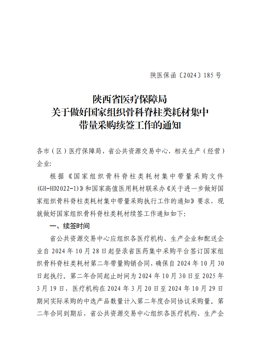 陜西省醫(yī)療保障局關(guān)于做好國家組織骨科脊柱類耗材集中帶量采購續(xù)簽工作的通知| 索引號(hào) | 610102073-1-2024-0130 | 發(fā)文字號(hào) | 陜醫(yī)保函〔2024〕185 號(hào) | ||