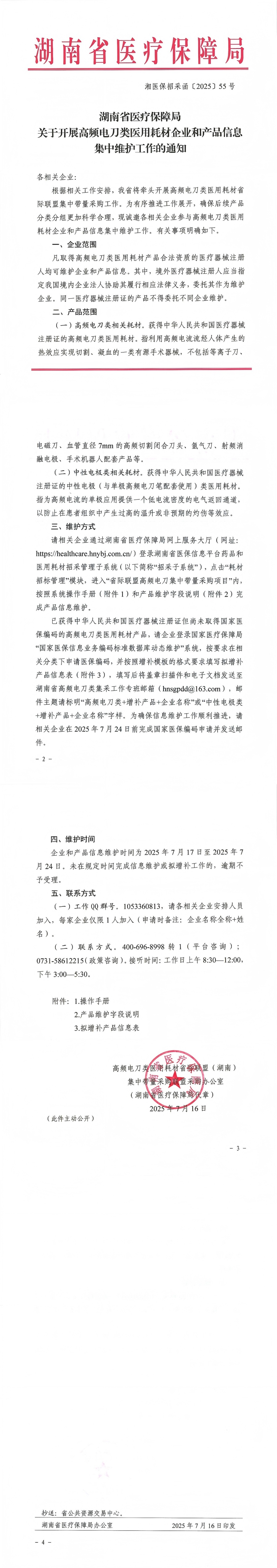 國(guó)家醫(yī)保編碼申請(qǐng)并發(fā)送郵件時(shí)間:7月16日-7月24日企業(yè)和產(chǎn)品信息維護(hù)時(shí)間:7月17日-7月24日工作QQ群號(hào):1053360813聯(lián)系方式:400-696-8998轉(zhuǎn)1(平臺(tái)咨詢(xún))0731-58612215(政策咨詢(xún))