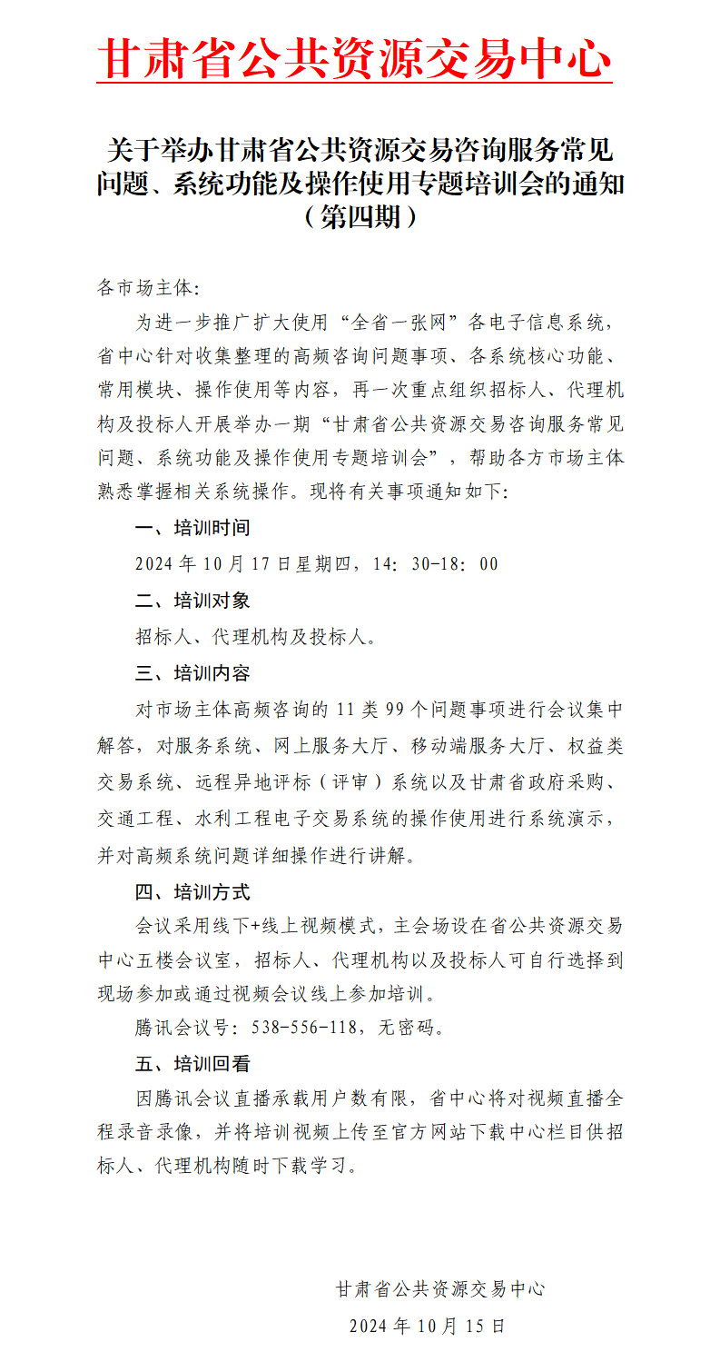各市場(chǎng)主體:為進(jìn)一步推廣擴(kuò)大使用“全省一張網(wǎng)”各電子信息系統(tǒng),省中心針對(duì)收集整理的高頻咨詢問(wèn)題事項(xiàng)、各系統(tǒng)核心功能、常用模塊、操作使用等內(nèi)容,再一次重點(diǎn)組織招標(biāo)人、代理機(jī)構(gòu)及投標(biāo)人開(kāi)展舉辦一期“甘肅省公共資源交易咨詢服務(wù)常見(jiàn)問(wèn)題、系統(tǒng)功能及操作使用專題培訓(xùn)會(huì)”,幫助各方市場(chǎng)主體熟悉掌握相關(guān)系統(tǒng)操作?,F(xiàn)將有關(guān)事項(xiàng)通知如下:一、培訓(xùn)時(shí)間2024年10月17日星期四,15:00-18:00二、培訓(xùn)對(duì)象招標(biāo)人、代理機(jī)構(gòu)及投標(biāo)人。三、培訓(xùn)內(nèi)容對(duì)市場(chǎng)主體高頻咨詢的11類99個(gè)問(wèn)題事項(xiàng)進(jìn)行會(huì)議集中解答,對(duì)服務(wù)系統(tǒng)、網(wǎng)上服務(wù)大廳、移動(dòng)端服務(wù)大廳、權(quán)益類交易系統(tǒng)、遠(yuǎn)程異地評(píng)標(biāo)(評(píng)審)系統(tǒng)以及甘肅省政府采購(gòu)、交通工程、水利工程電子交易系統(tǒng)的操作使用進(jìn)行系統(tǒng)演示,并對(duì)高頻系統(tǒng)問(wèn)題詳細(xì)操作進(jìn)行講解。四、培訓(xùn)方式會(huì)議采用線下+線上視頻模式,主會(huì)場(chǎng)設(shè)在省公共資源交易中心五樓會(huì)議室,招標(biāo)人、代理機(jī)構(gòu)以及投標(biāo)人可自行選擇到現(xiàn)場(chǎng)參加或通過(guò)視頻會(huì)議線上參加培訓(xùn)。騰訊會(huì)議號(hào):538-556-118,無(wú)密碼。五、培訓(xùn)回看因騰訊會(huì)議直播承載用戶數(shù)有限,省中心將對(duì)視頻直播全程錄音錄像,并將培訓(xùn)視頻上傳至官方網(wǎng)站下載中心欄目供招標(biāo)人、代理機(jī)構(gòu)隨時(shí)下載學(xué)習(xí)。