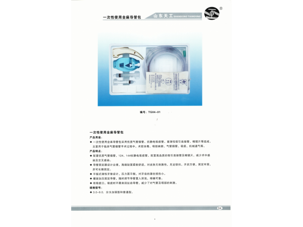 產(chǎn)品說明:規(guī)格型號:可抽吸氣管插管,根據(jù)導(dǎo)管大小可分為2.0、2.5、3.0、3.5、4.0、4.5、5.0、5.5、6.0、6.5、7.0、7.5、8.0、8.5、9.0、9