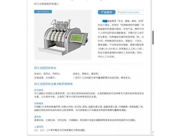 產(chǎn)品說明:臺潤智能配藥機是一種應用于PIVAS或配液室中的智能化配藥裝置,可解決藥劑師批量配藥的繁重手工勞動,避免當前處方和輸液方式中
