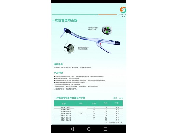 產(chǎn)品說明:臨床用于食管,胃,腸等消化道重建手術(shù),端端,側(cè)側(cè),端側(cè)吻合器適應(yīng)癥:適用于人體食道、胃及腸等消化道組織的端端吻合、端側(cè)吻