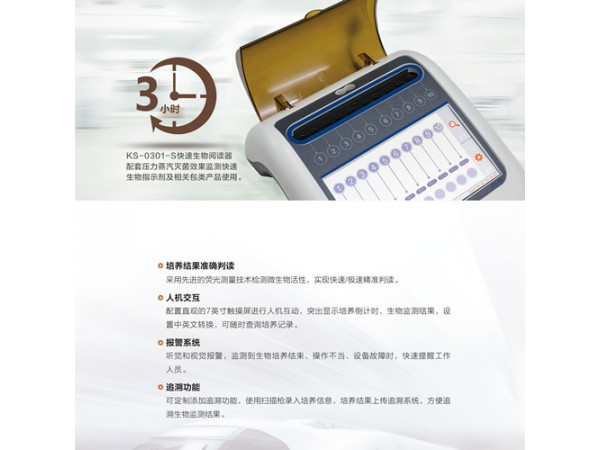 產(chǎn)品說明:KS-0301-S快速生物閱讀器技術(shù)指標(biāo)參數(shù)全進(jìn)口全自動(dòng)化操作。培養(yǎng)啥熱脂肪桿菌芽跑,可讀取用于監(jiān)測(cè) 121°C下排氣和 132”C預(yù)真空