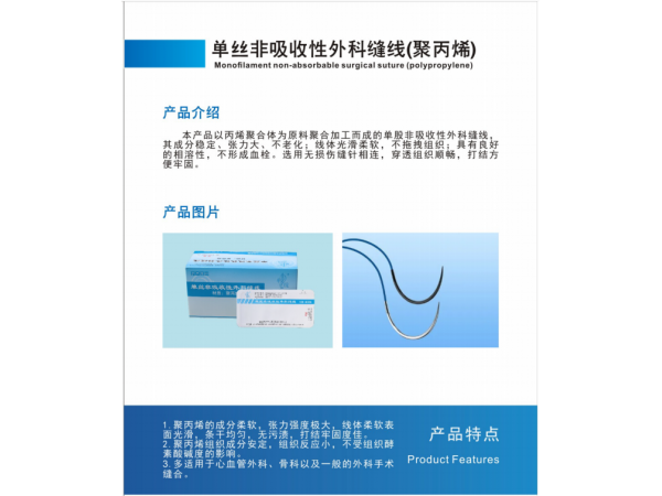 產(chǎn)品說(shuō)明:聚丙烯PP縫合線 單絲非吸收性外科縫合線 血管縫合線產(chǎn)品說(shuō)明:
