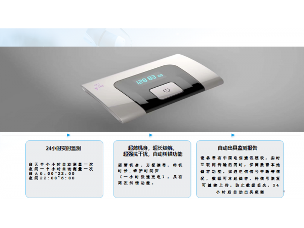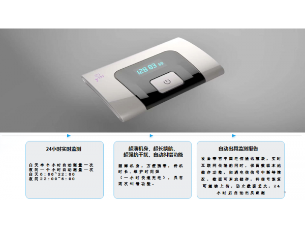 產(chǎn)品說明:一.功能介紹:24小時動態(tài)監(jiān)測即時通訊功能自動預(yù)警報警自動出具檢測報告超薄機身攜帶更方便超強抗干擾性第三代升壓技術(shù)NB LOT遠