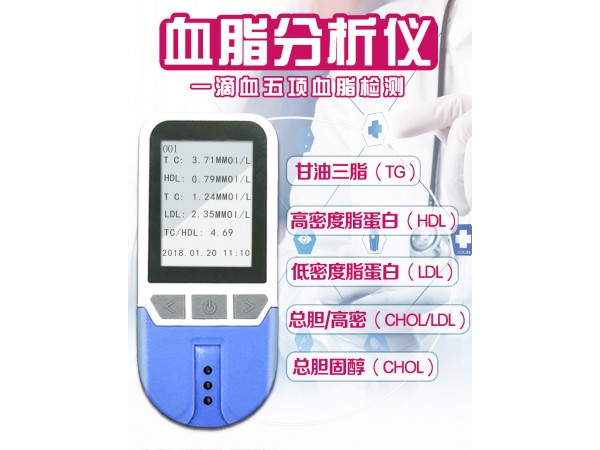 產(chǎn)品說明:干式化學分析儀血脂分析儀一滴血五項血脂檢測甘油三酯(TG)高密度脂蛋白(HDL)低密度脂蛋白(LDL ))總膽/高密( CHOL/LDL)總膽固