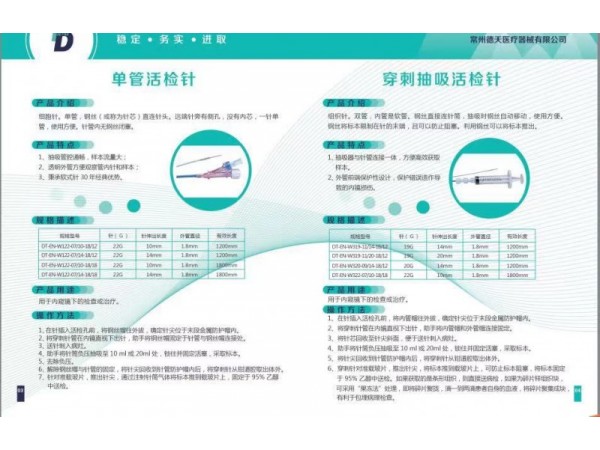 產(chǎn)品說(shuō)明:該套針的設(shè)計(jì)是用于對(duì)病人的肝臟組織進(jìn)行病理化驗(yàn)提供一種可靠的實(shí)用工具。其特點(diǎn)是分析結(jié)果準(zhǔn)確,且對(duì)病人所造成的創(chuàng)傷比較小,