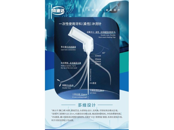 產(chǎn)品說明:它區(qū)別于傳統(tǒng)的金屬沖洗頭,“特迪達”柔性沖洗針由高分子(聚丙烯)材質(zhì)制成,頭部球頭設(shè)計,無利角,柔軟光滑容易彎曲,尖端有4%錐度,