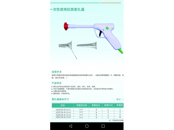 產(chǎn)品說明:一次性使用無菌肛腸套扎器適用范圍:適用于各期內(nèi)痔及混合痔或直腸良性息肉的套扎治療。結(jié)構(gòu)及組成:一次性使用無菌肛腸套扎器由