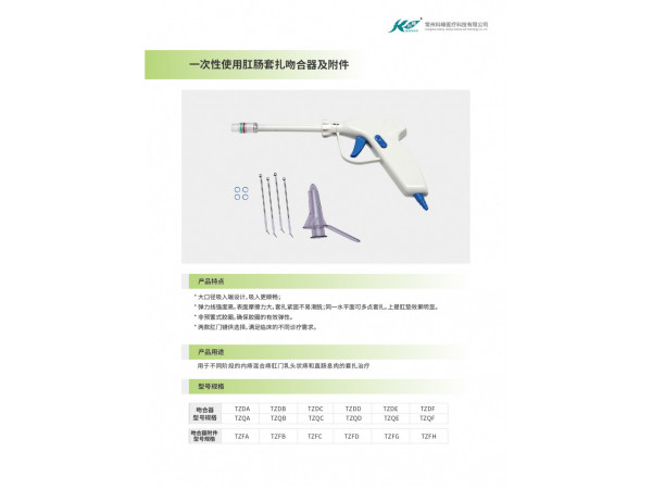 產(chǎn)品說明:彈力線痔瘡套扎器,自緊式彈力線痔瘡套扎吻合器是一款可自動(dòng)收緊彈力線的新型套扎吻合器,目前已有三項(xiàng)高新技術(shù)獲得國(guó)家專利;以