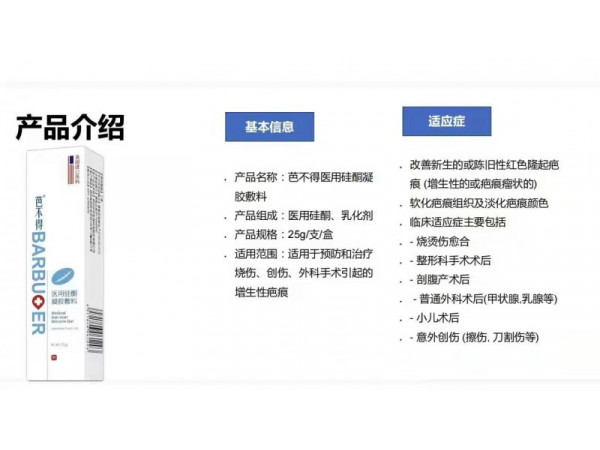 產(chǎn)品說明:適用于抑制體表外傷、燒傷、手術(shù)原因引起的增生性疤痕。用于輔助改善皮膚病理性疤痕,輔助預(yù)防皮膚病理性疤痕的形成。