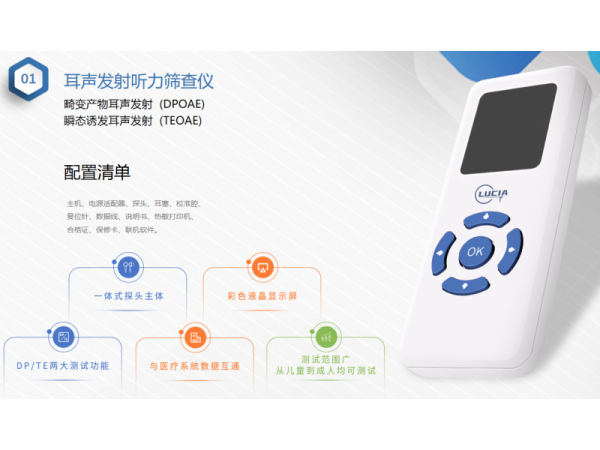 產(chǎn)品說明:適用范圍:用于畸變產(chǎn)物耳聲發(fā)射(DPOAE)和瞬態(tài)誘發(fā)性耳聲發(fā)射(TEOAE)的聽力篩查。適用場景(科室 / 機構(gòu) / 人群)1. 核心臨