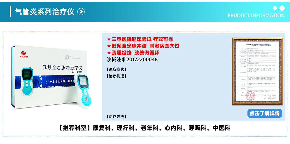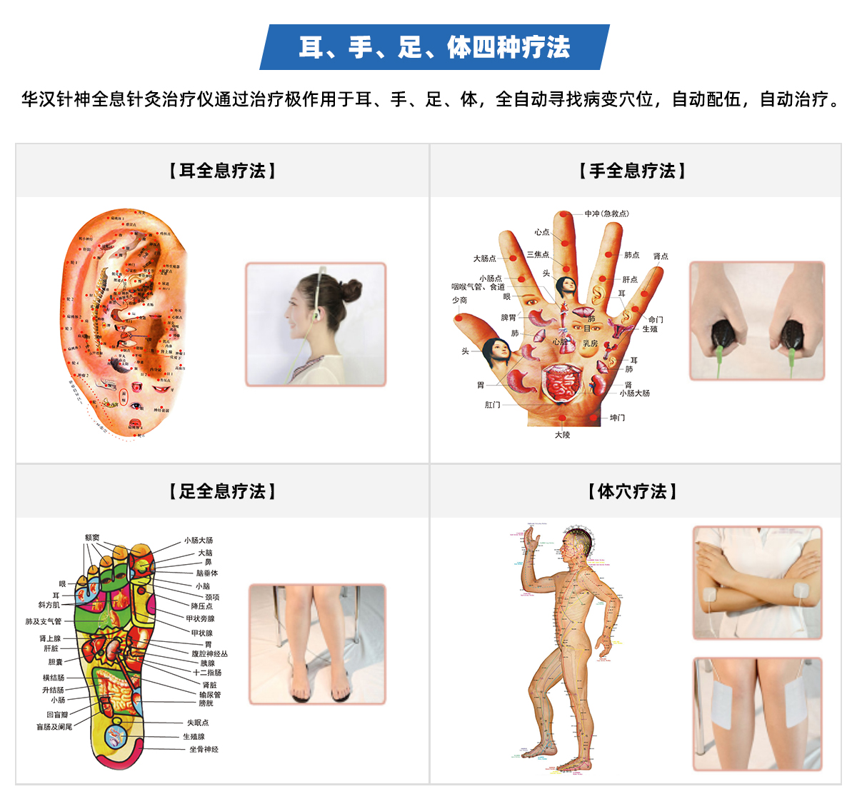 1.華漢針神低頻全息脈沖自動(dòng)尋找病變穴位,通過(guò)對(duì)穴位刺 激,促進(jìn)氣管炎、慢性支氣管所致的氣管損傷修復(fù),使柱狀 上皮細(xì)胞的病理性損害得以減輕。 2.華漢針神低頻全息脈沖通過(guò)疏通經(jīng)絡(luò)、調(diào)和氣血,改善輕 微循環(huán)障礙,起到緩解、防治氣管炎、慢性支氣管炎等疾病 的作用。 耳全息+手全息+足全息+體穴療法同時(shí)治療 |