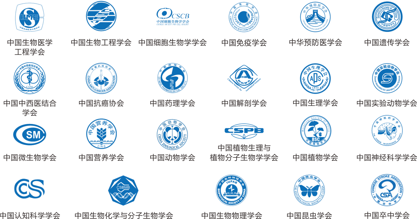 中國生物醫(yī)學(xué)工程學(xué)會(huì)、中國生物工程學(xué)會(huì)、中國細(xì)胞生物學(xué)學(xué)會(huì)、中國免疫學(xué)會(huì)、中華預(yù)防醫(yī)學(xué)會(huì)、中國遺傳學(xué)會(huì)、中國中西醫(yī)結(jié)合學(xué)會(huì)、中國抗癌協(xié)會(huì)、中國藥理學(xué)會(huì)、中國解剖學(xué)會(huì)、中國生理學(xué)會(huì)、中國實(shí)驗(yàn)動(dòng)物學(xué)會(huì)、中國微生物學(xué)會(huì)、中國營養(yǎng)學(xué)會(huì)、中國動(dòng)物學(xué)會(huì)、中國植物生理與植物分子生物學(xué)學(xué)會(huì)、中國植物學(xué)會(huì)、中國神經(jīng)科學(xué)學(xué)會(huì)、中國認(rèn)知科學(xué)學(xué)會(huì)、中國生物化學(xué)與分子生物學(xué)會(huì)、中國生物物理學(xué)會(huì)、中國昆蟲學(xué)會(huì)、中國卒中學(xué)會(huì)