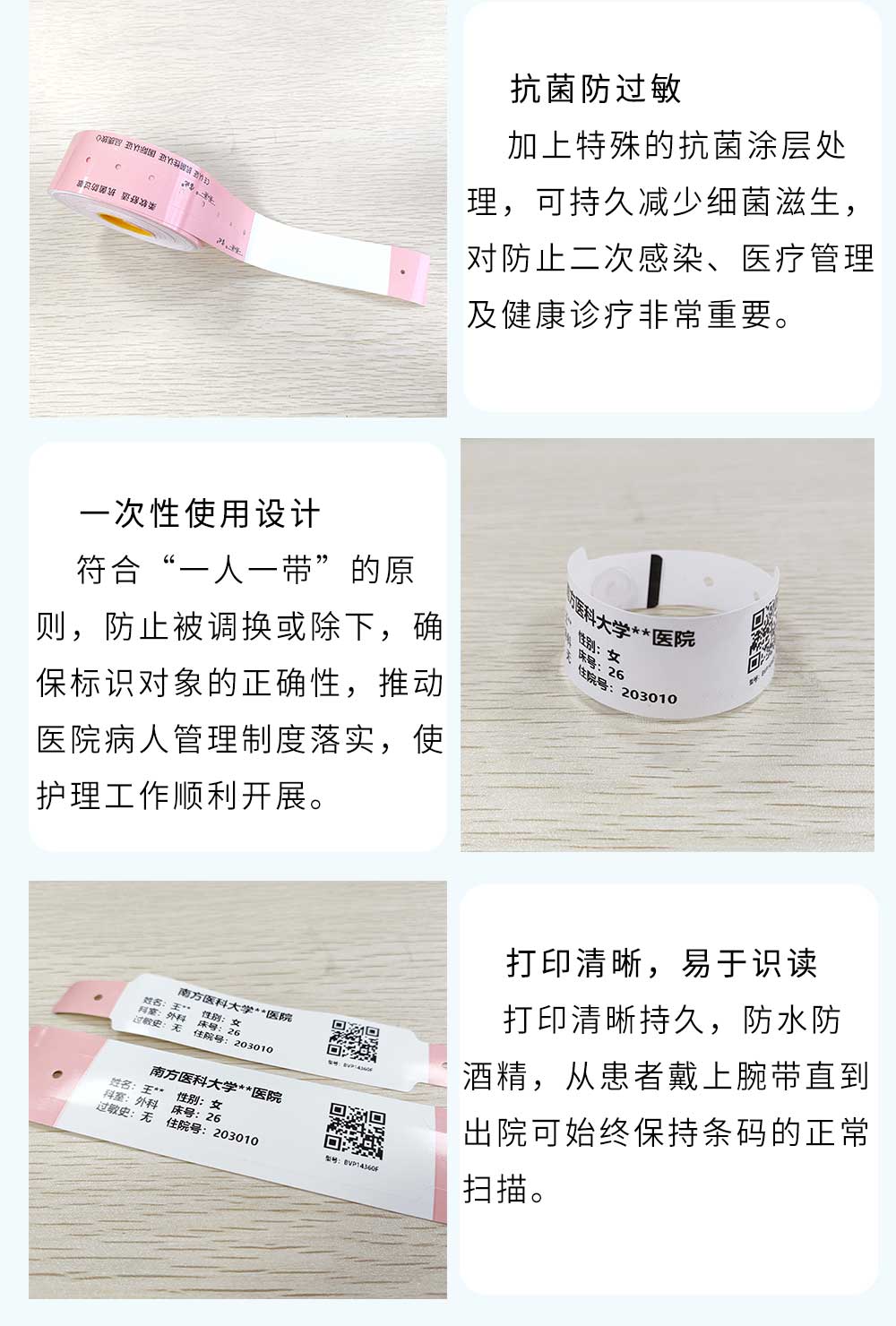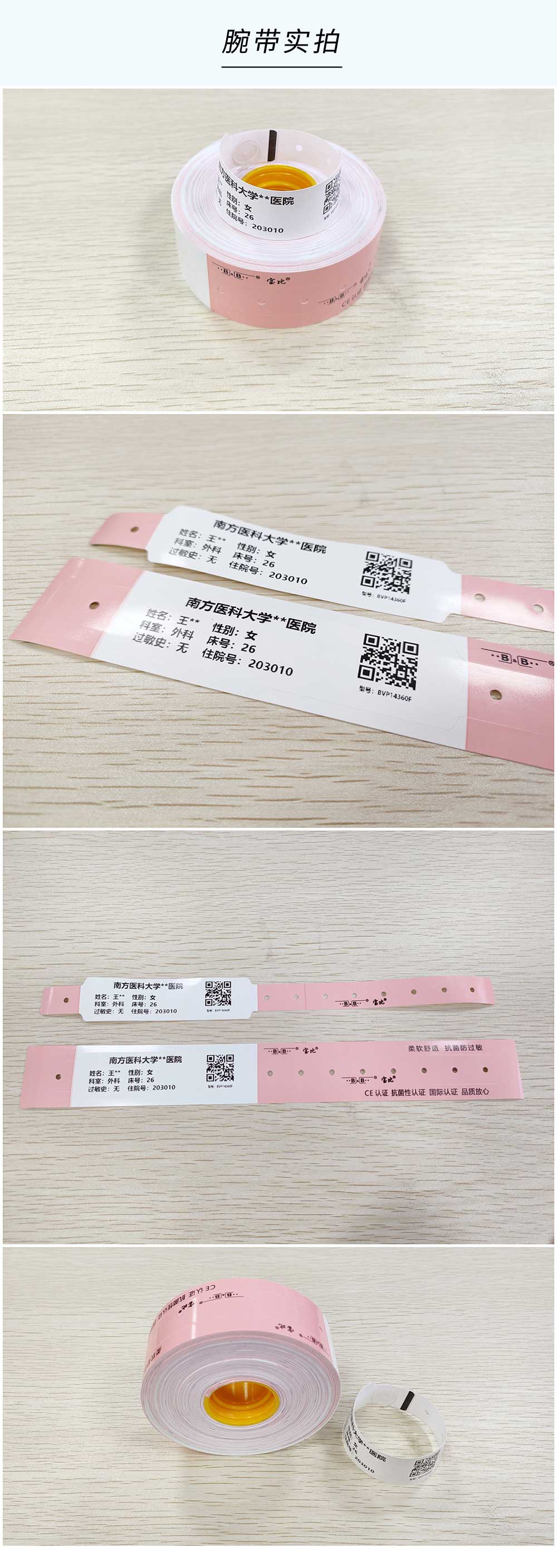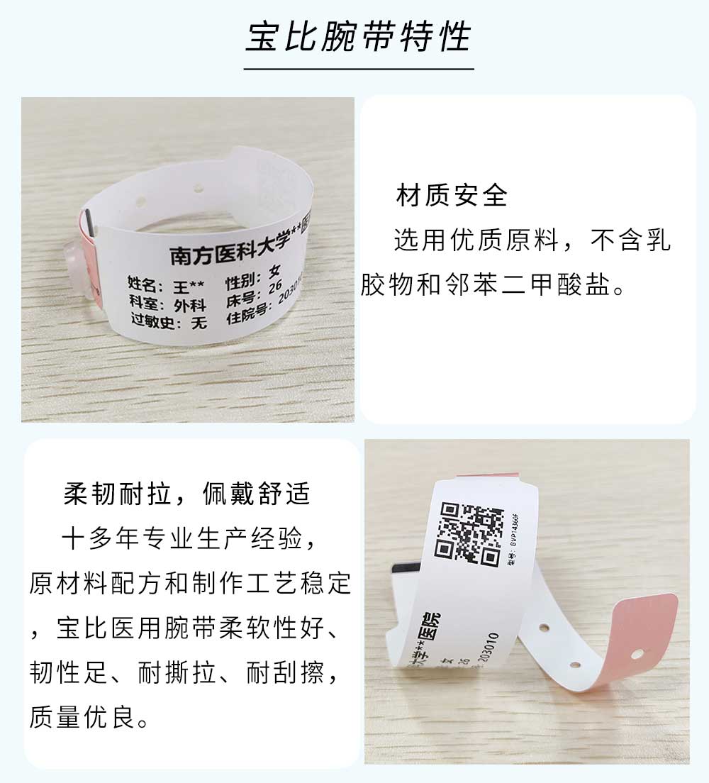 熱敏材質(zhì);一次性使用,不可轉(zhuǎn)移;防水防酒精,抗菌防過敏,國際認證,品質(zhì)放心!可根據(jù)客戶需求自定義文字,一維碼,二維碼,圖片等打印內(nèi)容,且能在數(shù)秒內(nèi)通過寶比腕帶打印機BB777打印出來