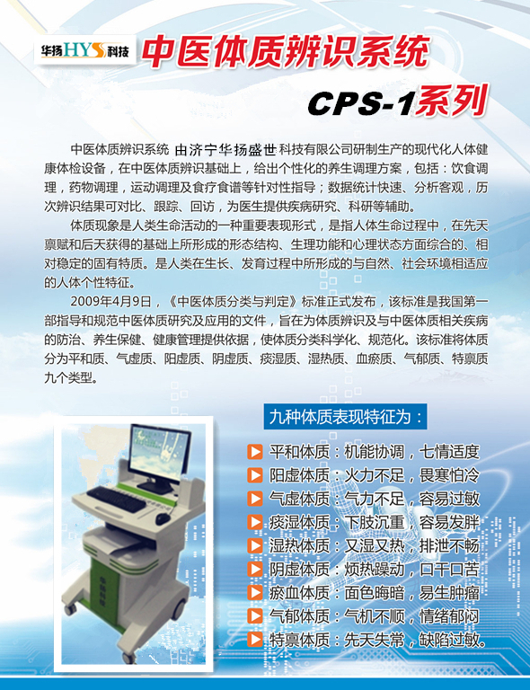 ? ? 中醫(yī)體質(zhì)辨識(shí)系統(tǒng)由濟(jì)寧華揚(yáng)盛世醫(yī)療科技有限公司研發(fā),儀器主要對(duì)人體體質(zhì)進(jìn)行辨識(shí),通過人機(jī)對(duì)話判斷患者的體質(zhì)類型。中醫(yī)體質(zhì)辨識(shí)儀器把傳統(tǒng)中醫(yī)進(jìn)行電腦化,使的更多的人能了解中體享受中醫(yī)的饋贈(zèng)。本公式產(chǎn)品有中醫(yī)體質(zhì)辨識(shí)儀,身高體重測(cè)量儀,嬰幼兒體檢儀,兒童發(fā)展評(píng)價(jià)系統(tǒng),兒童生長發(fā)育測(cè)評(píng)儀,兒童智力測(cè)試儀,兒童綜合素質(zhì)測(cè)試儀,極譜儀等