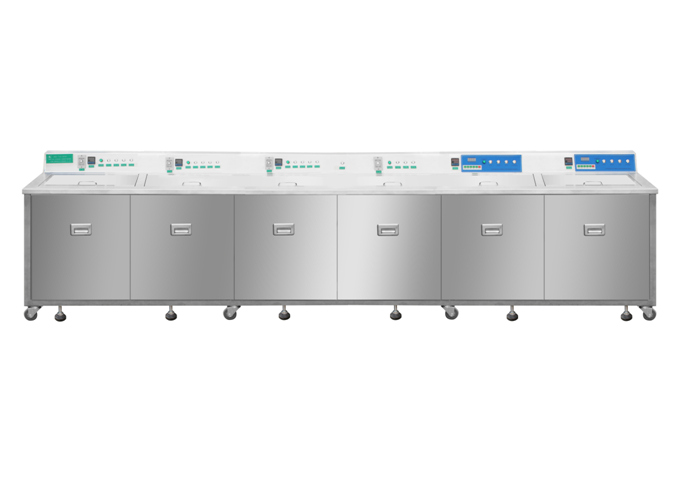 GTH系列醫(yī)用超聲波清洗機(jī)清洗工序:超聲波粗洗→超聲波精洗→(高壓水槍輔助沖洗)→噴淋沖洗→煮沸消毒→熱浸上油→熱風(fēng)干燥。