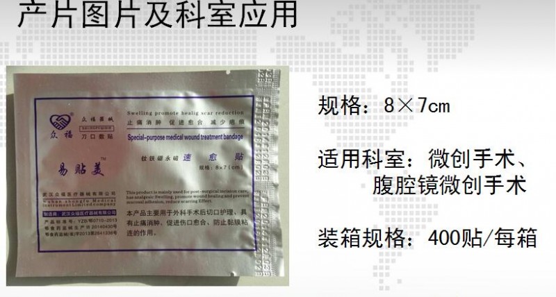 ?功能:本產(chǎn)品《釹鐵硼永磁速愈貼》主要用于外科手術(shù)切口的護(hù)理,具有止痛、消腫、促進(jìn)傷口愈合、防止粘膜粘連、減少疤痕的作用。優(yōu)勢(shì);替代傳統(tǒng)換藥,適用于手術(shù)室、普外科、骨科、腦外泌外科、婦產(chǎn)科等科室使用,產(chǎn)品除住院使用外醫(yī)生還可以開處方給患者帶回家自己使用,產(chǎn)品適應(yīng)科室廣泛、用量大空間大。