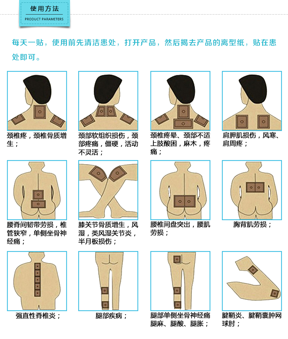 【用法用量】每天一貼,使用前先清潔患處,打開產(chǎn)品,然后揭去產(chǎn)品的離型紙,貼在患處即可。