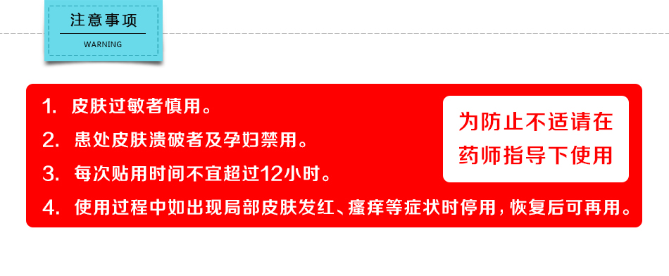 【注意事項】1、皮膚過敏者慎用。 2、患處皮膚潰破者及孕婦禁用。 3、每次貼用時間不宜超過12個小時。 ?4、使用過程中如出現(xiàn)局部皮膚發(fā)紅、瘙癢等癥狀時停用,恢復后可再用。