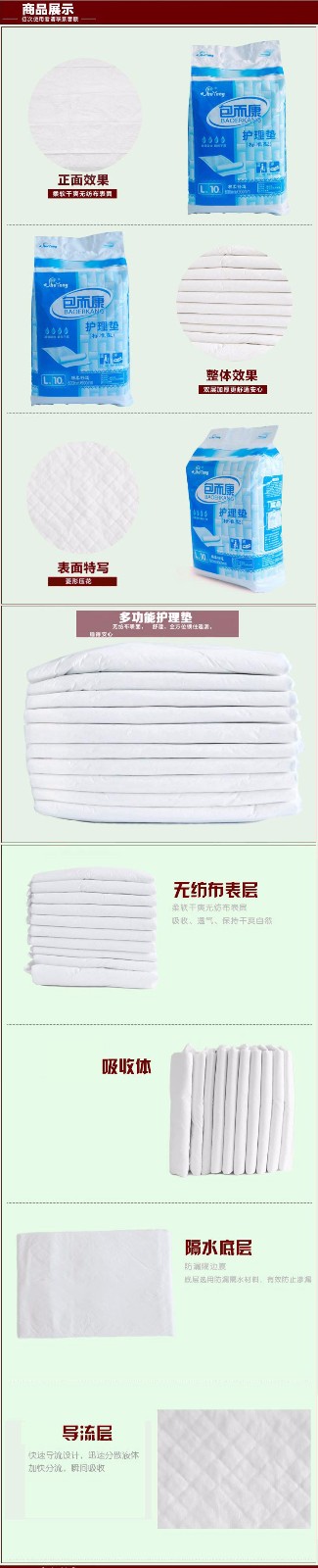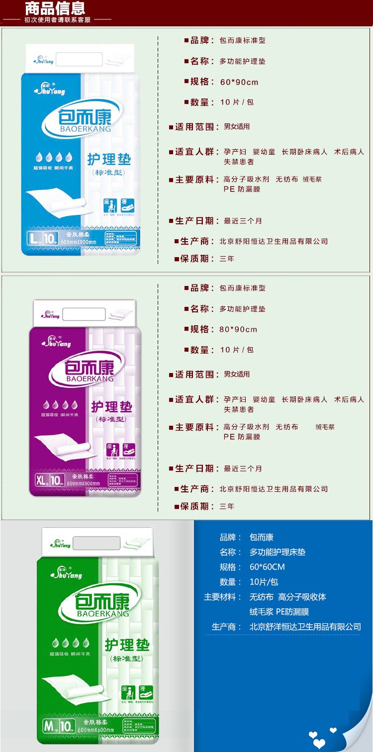 包而康成人護理墊主要適用于產(chǎn)褥期婦女,經(jīng)期婦女,失禁者,老年癡呆中風臥床者,臥床不能自理人員,老年人偏袒大小便失禁者等等,以上患者的小便的吸收,大便當中稀便的吸收(在排完大便之后即可一次性丟棄),主要特性就是吸收量大,表面是純棉制造,不含任何化工原料,包而康成人護理墊的主要原料是純棉無紡布、植物有機高分子、純棉絨毛漿、防漏PE膜。等,包而康是北京舒洋恒達衛(wèi)生用品有限公司生產(chǎn),其一切的售后問題,如需換貨、退貨等問題即可找舒洋恒達公司客服處理:客服電話:010-67670970