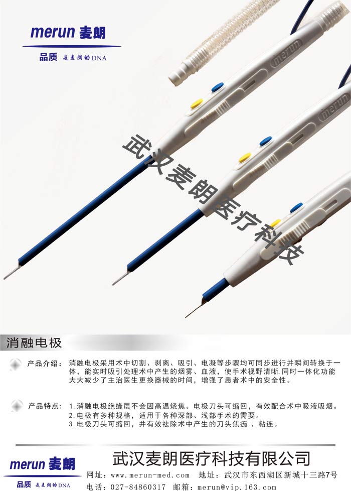 武漢麥朗醫(yī)療科技有限公司是一家專(zhuān)門(mén)生產(chǎn)電刀耗材的生產(chǎn)型企業(yè)。多年來(lái)一直致立于研發(fā)、生產(chǎn)電刀耗材。一直以來(lái),以質(zhì)優(yōu)價(jià)廉的市場(chǎng)供應(yīng)策略為平臺(tái)使公司不斷發(fā)展。目前主要生產(chǎn)消融電極系列:電凝鑷(一次性滴水、反復(fù)使用)、一次性刀筆(普通形、可伸縮型、刮吸型、微創(chuàng)鎢針形、腳控型)、利普刀刀頭、負(fù)極板(單、雙極)、負(fù)極板連接線(xiàn)、電刀清潔片、醫(yī)用腳踏開(kāi)關(guān)以及各種電刀上使用的醫(yī)用導(dǎo)線(xiàn)。如果您對(duì)我們的產(chǎn)品感興趣,請(qǐng)來(lái)電咨詢(xún)我們零貳柒-捌肆捌陸零叁壹柒,可登錄武漢麥朗醫(yī)療科技有限公司網(wǎng)站或關(guān)注微信公眾號(hào):麥朗醫(yī)療