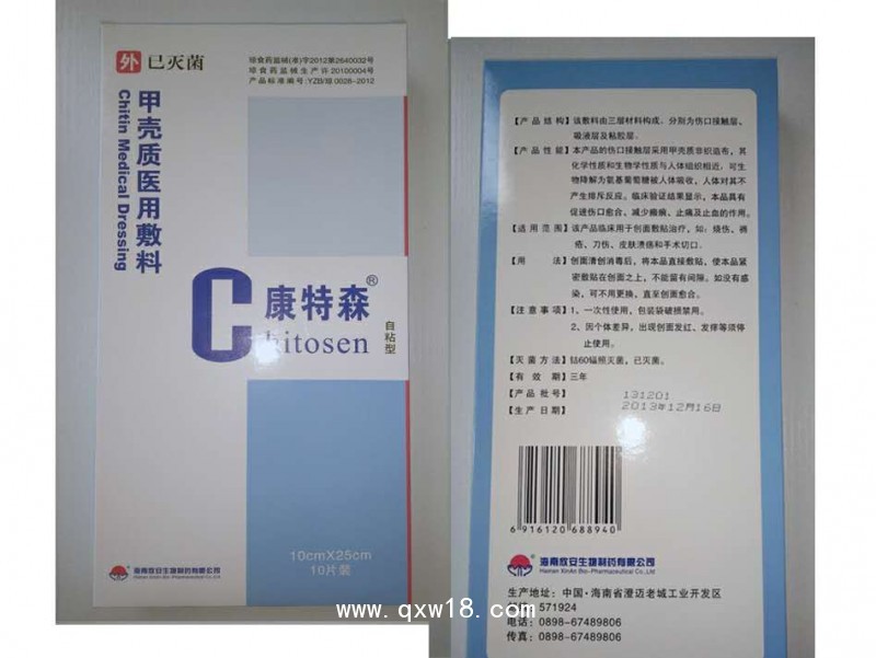 產(chǎn)品性能:本產(chǎn)品的傷口接觸層采用甲殼質(zhì)非織造布,其化學(xué)性質(zhì)和生物學(xué)性質(zhì)與人體組織相近,可生物降解為氨基葡萄糖被人體吸收,人體對其不產(chǎn)生排斥反應(yīng)。臨床驗證結(jié)果顯示,本品具有促進(jìn)傷口愈合、減少瘢痕、止痛及止血的作用。