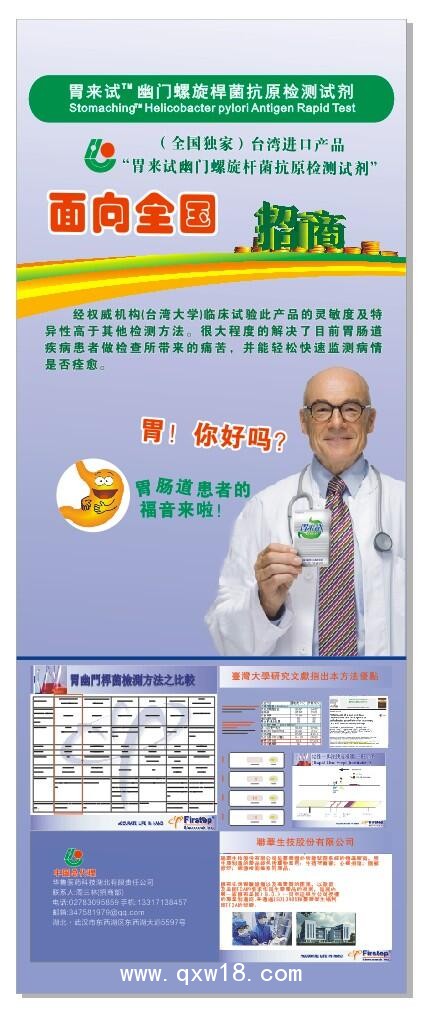 幽門螺旋桿菌抗原診斷試劑(糞便檢測,十分鐘內可判讀結果)與目前臨床應用的呼氣法在靈敏度,特異性等有很大的優(yōu)勢,市場前景好,潛力大??蓱孟?,胃腸道,檢驗科,疾控中心,職工體檢項目。