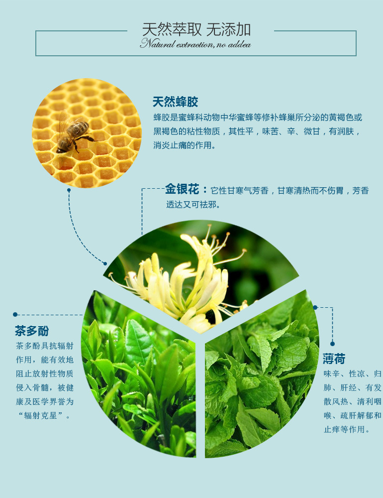 【產(chǎn)品成分】:蜂膠、茶多酚、金銀花、薄荷精油等等。