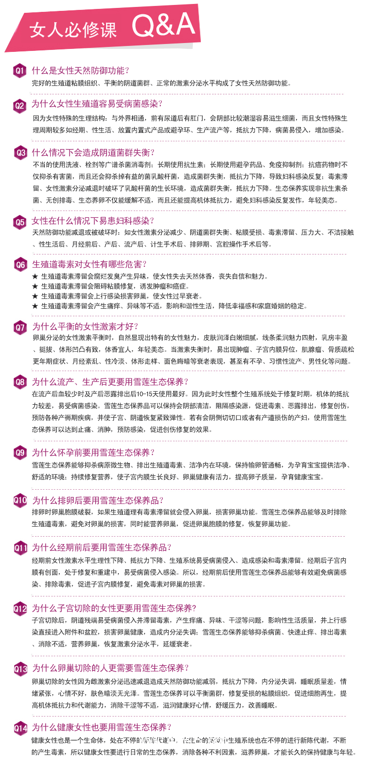 修復天然防御功能、遠離婦科疾病、提高性福指數。使用3盒,每天2片;天山雪蓮花、蘆筍、黃芪等獨有的修復因子,能夠快速修復受損的粘膜及創面、恢復天然防御功能和生殖系統的正常功能,遠離婦科疾病。