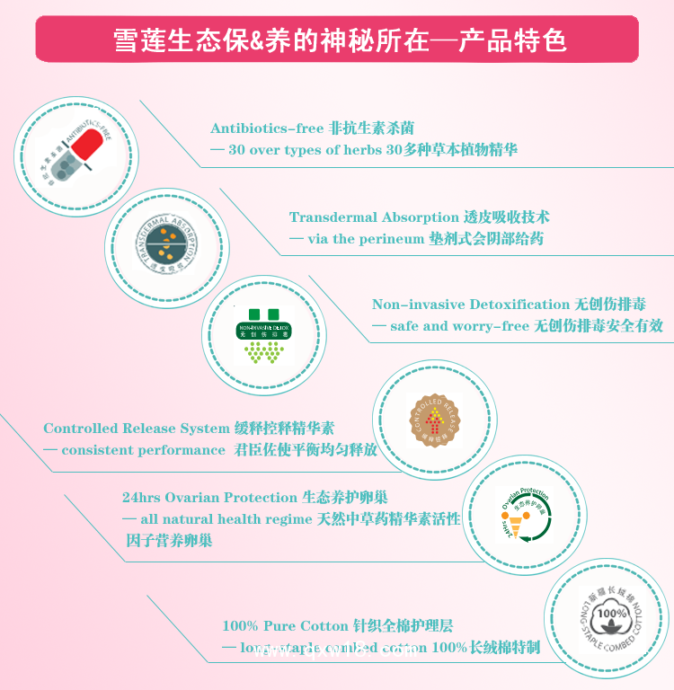 排毒養元貼融入多項高科技技術,充分滿足女性生態保養的需求,利用女性會陰部粘膜嬌嫩,末梢血液循環旺盛、易吸收的特點,會陰部直接貼敷,透皮吸收,方便快捷。天山雪蓮花等名貴植物精華生態保養生殖系統,非抗生素殺菌;平衡菌群、預防感染;無創排毒,潔凈內在、修復粘膜;生態養卵,平衡激素水平,從源頭上長期維護女性整體健康、幸福與年輕。