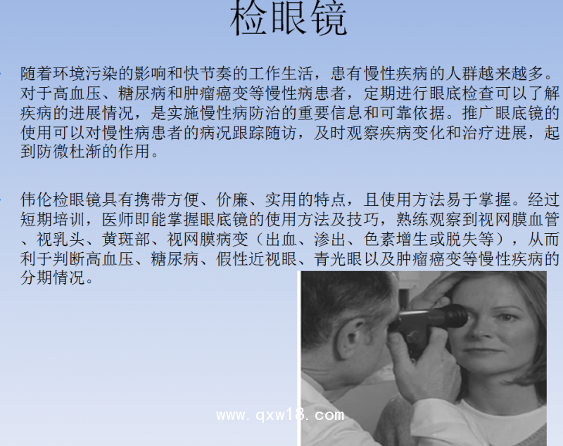 1、Welch是偉倫公司的創(chuàng)始人,也是世界上第一個(gè)發(fā)明眼底檢眼鏡的醫(yī)師。在同類產(chǎn)品中,偉倫公司生產(chǎn)的檢眼鏡更具有權(quán)威性。