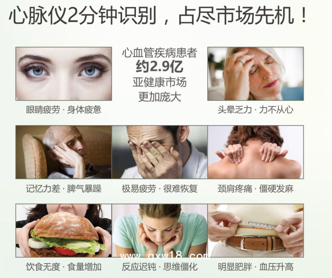 亞健康人群:(長期疲勞、作息紊亂、睡眠不佳、吸煙酌酒)實時監(jiān)測,風(fēng)險預(yù)警、定期監(jiān)測您的心血管功能以及壓力、疲勞、焦慮三大亞健康指數(shù)。提醒您改變目前不良的生活方式,及時咨詢醫(yī)生,有效的減少疾病和意外的發(fā)生。