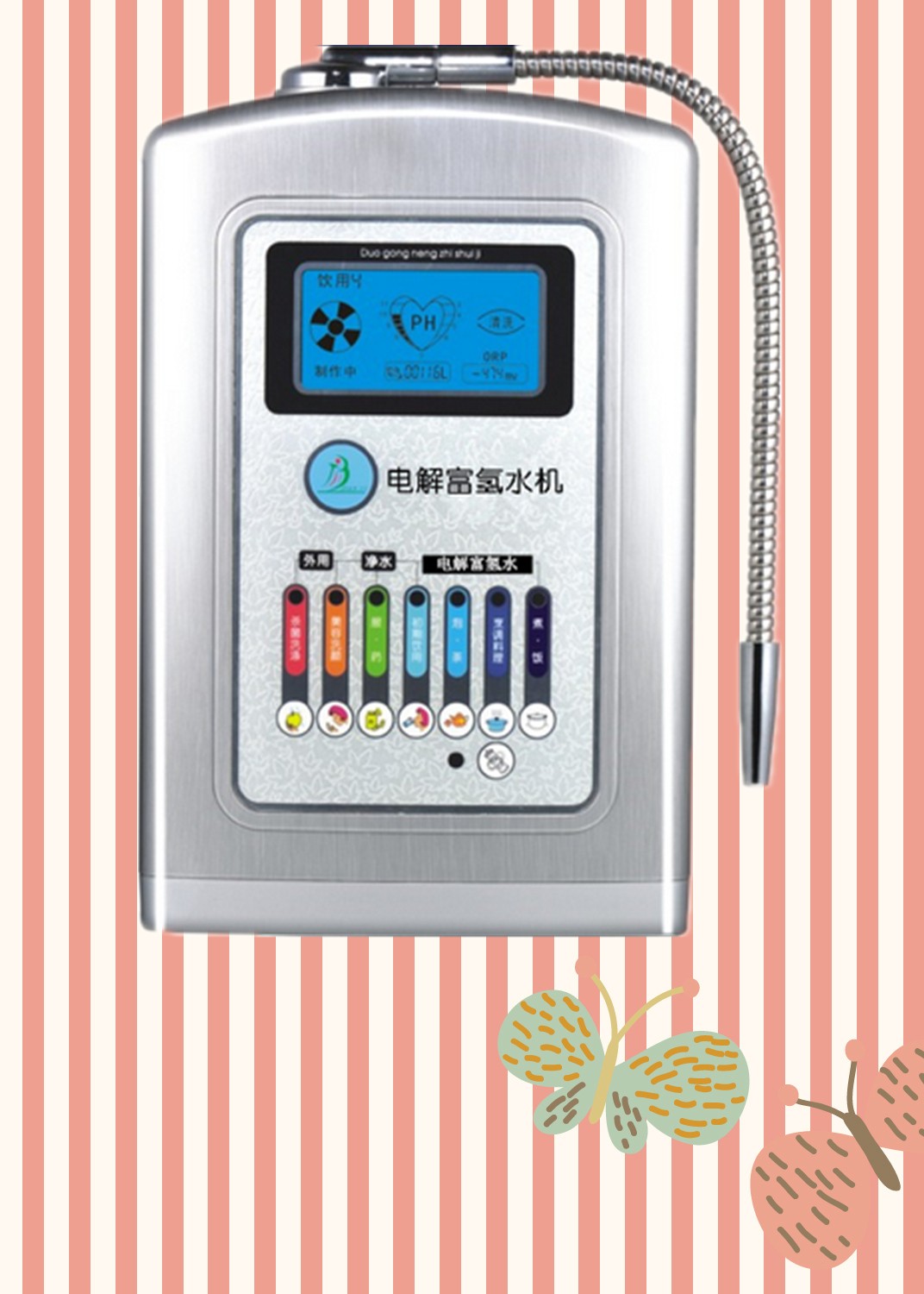 7個(gè)檔位分為電解還原水4個(gè)檔位,分別是:初期飲用、泡茶、烹調(diào)料理、煮飯