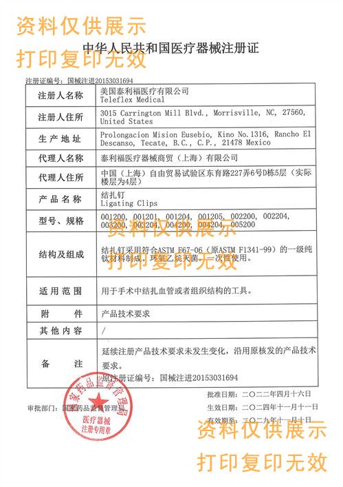 美國泰利福 Teleflex 鈦夾、結(jié)扎釘001204產(chǎn)品說明: