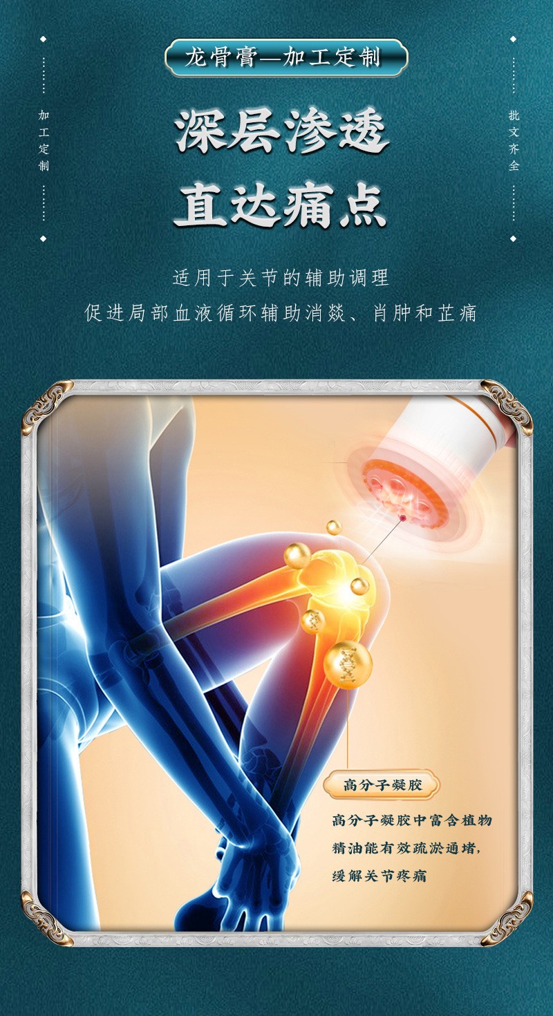 骨科耗材產品加工 外用龍骨膏草本發(fā)熱按摩膏美容院身體護理活絡腰椎關節(jié)疼痛凝膠加代工產品說明: