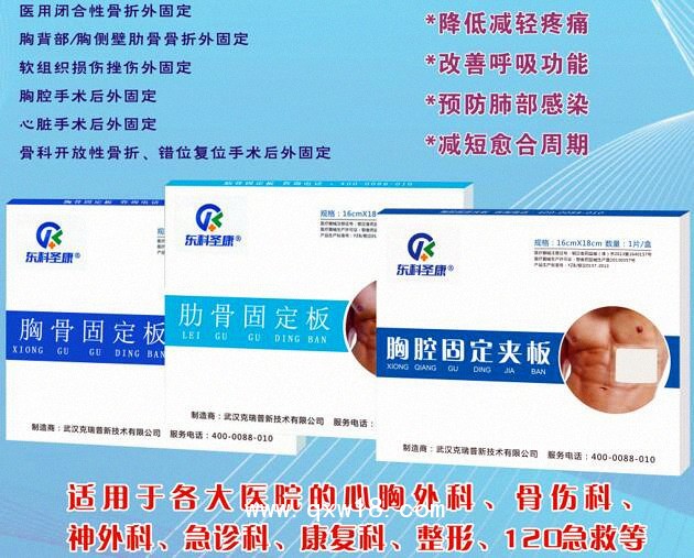 產(chǎn)品包裝:每盒產(chǎn)品內(nèi)含專用夾板1片+多功能專用肋骨固定板1條(術(shù)前、術(shù)后、康復(fù)期多用途)。