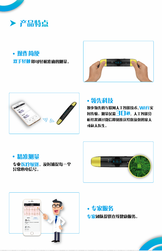 可以快速方便的檢測(cè)記錄心電圖,測(cè)量?jī)H需30秒,WiFi實(shí)時(shí)傳輸,獨(dú)步領(lǐng)先的互聯(lián)網(wǎng)人工智能技術(shù)解讀測(cè)量結(jié)果,通過微信即刻推送給您及您的家人和私人醫(yī)生,專家團(tuán)隊(duì)提供在線的健康服務(wù),為您及家人的心臟健康保駕護(hù)航。