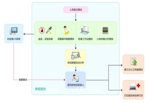 居民健康體檢系統(tǒng)是專門針對國家基本公共衛(wèi)生服務老年人體檢開發(fā)的,該方案將查體流程分為人員登記模塊、抽血(生化、血常規(guī)檢測)模塊、尿液檢測模塊、基本測量模塊、B超檢測模塊、心電檢測模塊、體檢信息錄入模塊,合理安排查體人員的流程和模塊化操作,提高了查體效率,實現(xiàn)查體數(shù)據(jù)的真實性、完整性,最后在系統(tǒng)中導出各類反饋表報表、體檢數(shù)據(jù)統(tǒng)計,有效降低了工作人員工作強度。