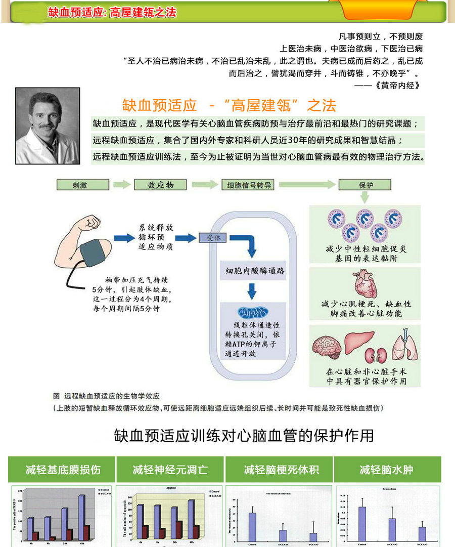 對人的心、腦等重要器官在預先接受短暫、非致病的缺血缺氧后,使致產生自身內源性保護物質(如腺苷、緩激肽、一氧化氮等……),從而減輕隨后持續(xù)更長時間缺血引起的心肌梗死和腦梗塞,降低心腦血管疾病的致殘率和死亡率。這種現象稱為缺血預適應(ischemic preconditioning)。隨后的臨床研究發(fā)現,這種保護作用,不但出現在同一器官之中,而且肢體等器官的缺血預適應也可減輕心、腦、腎、肺、肝臟等器官的嚴重缺血引起的后果,稱為遠程缺血預適應(remote ischemic conditioning) 。
