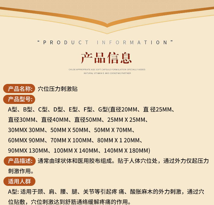?【產(chǎn)品描述】通常由球狀體和醫(yī)用膠布組成。貼于人體穴位處,通過外力僅起壓力刺激作用。