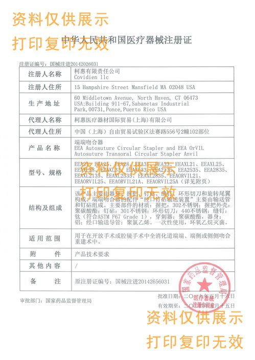 該產(chǎn)品主要由器身、握把、釘砧、縫釘、環(huán)形切刀和旋轉(zhuǎn)尾翼構(gòu)成。端端吻合器的配件“經(jīng)口釘砧輸送裝置”主要由輸送管和釘砧組成。主要部件的材質(zhì):握把:302不銹鋼;握把外殼:聚碳酸酯;釘砧:301不銹鋼;環(huán)形切刀:440不銹鋼;縫釘:鈦(符合ASTM